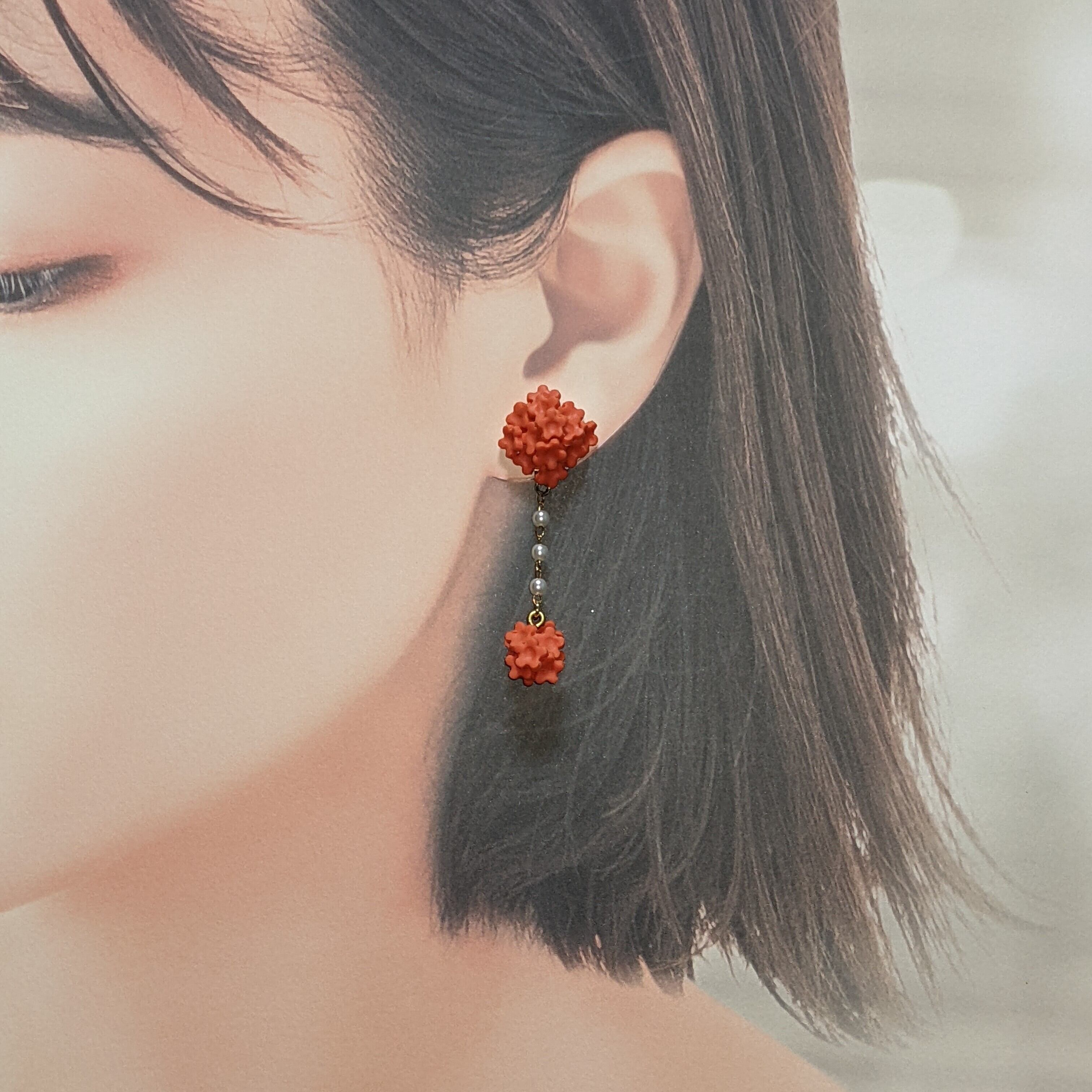 材料:ポリマークレイ、樹脂パールチェーン、クリップ式イヤリング